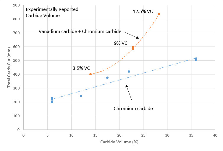 The label next to the datapoints indicates the amount of vanadium carbide (VC) while the x-axis overall carbide volume includes the additional Cr-carbides. As is clear from that image, vanadium carbides are more effective at improving slicing edge retention than chromium carbides in the CATRA test. It requires a much higher overall carbide volume of chromium carbide to match a steel that contains a significant amount of vanadium carbide. It is obvious that the higher hardness of vanadium carbide leads to superior wear resistance in this test.