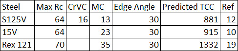 Rex 121, with its very high hardness and incredibly high MC carbide fraction, has a very high predicted TCC value. Despite having “only” 9.5% vanadium in Rex 121, the high Mo and W reportedly increases the MC fraction, forming a complex Mo-W-V carbide [19]. When the answer to any steel-related question is Rex 121 I start to wonder why I was asking the question in the first place. The grindability, toughness, sharpenability, etc. of Rex 121 are all incredibly poor, because those properties are generally inversely correlated with edge retention. That is why this article (and Part 2) focuses primarily on what controls edge retention. When we understand what variables control different properties, then we can design or select steels with the right balance of properties for our intended use. Edge retention is just one of those properties. I’m not sure I personally care which steel has the very highest edge retention but I did promise an answer to the question so here it is.