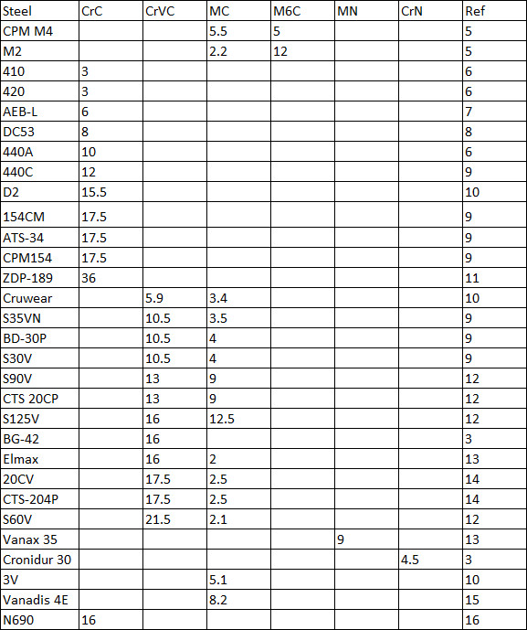 As discussed earlier, the volume fraction of carbide is important for overall wear resistance. Unfortunately, the volume and type of carbides present in a heat treated steel is not always known. In many cases there are values reported in different journal articles or datasheets but this is often for only one heat treatment. However, what experimental values are available is better than nothing, and is at least qualitatively useful if not 100% accurate to the heat treatment and specific steel composition utilized in whatever testing was performed. I used all values of which I am aware for the steels that were tested from a variety of sources [3,5-16]. It is also possible to calculate carbide fractions with Thermodynamic software like JMatPro or ThermoCalc but I have restricted this article to the discussion of experimentally reported carbide content. Using the calculated carbide fractions allows a comparison between all of the steels but experimental values are more accurate.