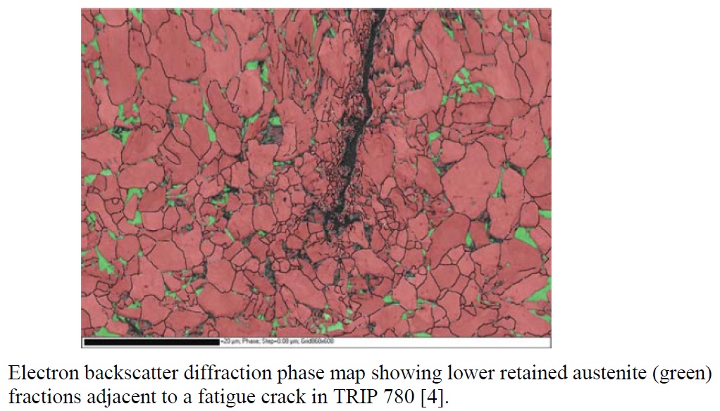 It has been found that the transformation of retained austenite to untempered martensite can actually slow down crack growth during this fatigue testing. Martensite is a larger phase than austenite and the volume change “pushes” the crack back together. You can see this in the image below where austenite is green and transforms to black martensite around the crack where the material was stressed [28]: