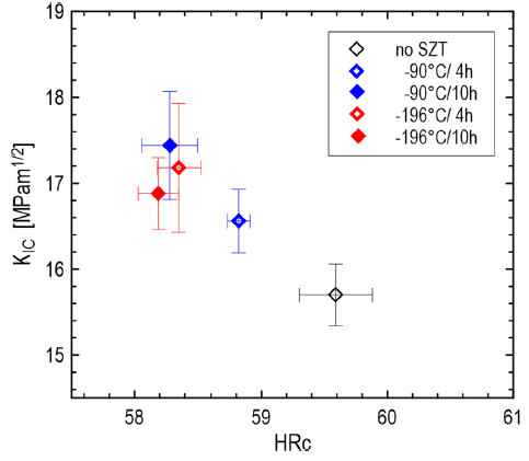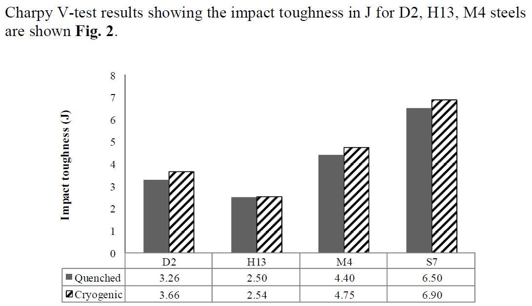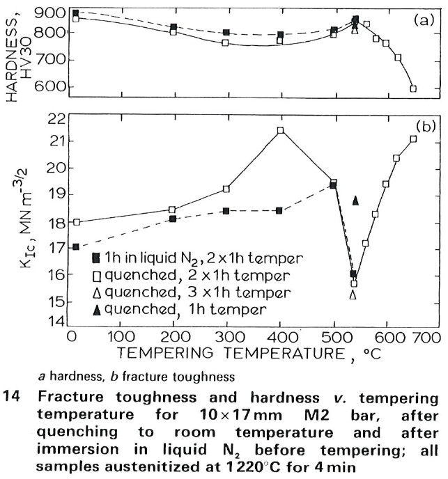 In another study they looked at D2, H13, M4 (non-PM), and S7 tool steels [21] which were heat treated with an upper temper (>400°C), both with and without a 20 hour cryogenic process at liquid nitrogen temperatures. No hardness information was presented but there was a chart giving toughness numbers with very tiny improvements in toughness:
