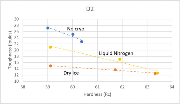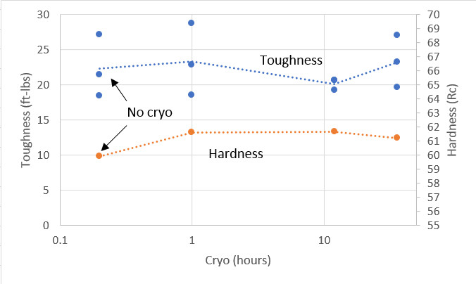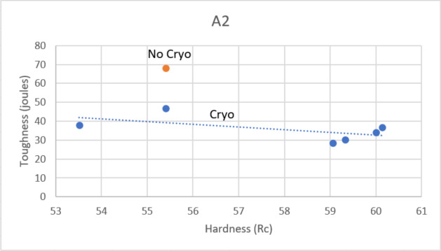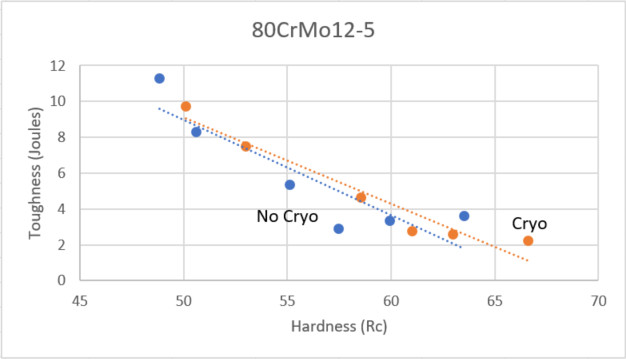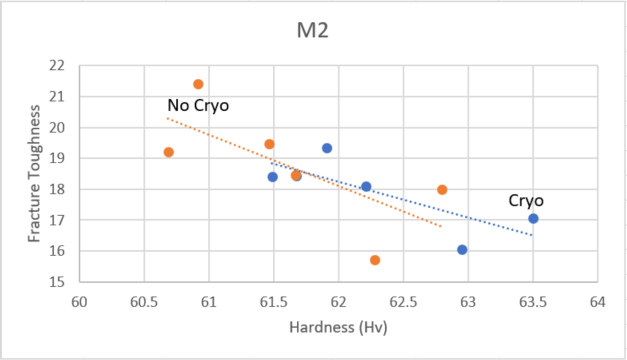 Cryo generally increases hardness which we would expect to lead to a reduction in toughness. Some studies that showed a reduction in toughness with cryo do not show a difference if the toughness is plotted vs hardness. This compensates for the effect of hardness and allows us to compare cryo vs no cryo in a more apples-to-apples fashion. One example is this study with M2 where when plotted vs hardness there is no clear difference in toughness when cryo is used [20]: