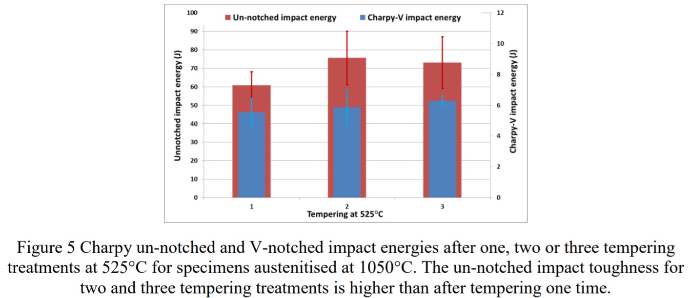 All of the studies where no change in toughness was observed were all with steels given an upper temper [8,11,12,14,19,23], which makes sense for the reasons explained before, that secondary hardening leads to an elimination of retained austenite so there is little or no difference when a cryo step is added.