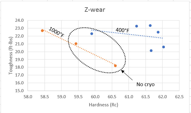For the reasons explained above I was surprised that there was no difference in toughness found when using cryo with Z-Wear and a low temperature temper of 400°F. Generally a reduction in retained austenite and increase in hardness with cryo leads to a reduction in toughness. It is encouraging that a cryo treatment does not necessarily reduce toughness even with a low temperature temper though this is not the case with every steel and heat treatment. Perhaps future studies will reveal more.
