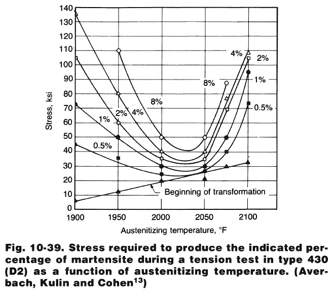Somewhat surprisingly, the stress required for the start of austenite transformation increased with more austenite. However, the stress required for the 8% transformed retained austenite reached a minimum with 2000-2050°F austenitizing temperatures. Those austenitizing temperatures are too high for typical heat treating of D2, fortunately. Typically a temperature of 1825-1900°F is recommended. Regardless, it is apparent that austenite can transform from induced stress which leads to untempered martensite. It’s hard to mentally visualize the level of stress required to cause the austenite transformation, but the level of stress is well below the strength of the heat treated D2 [2]: