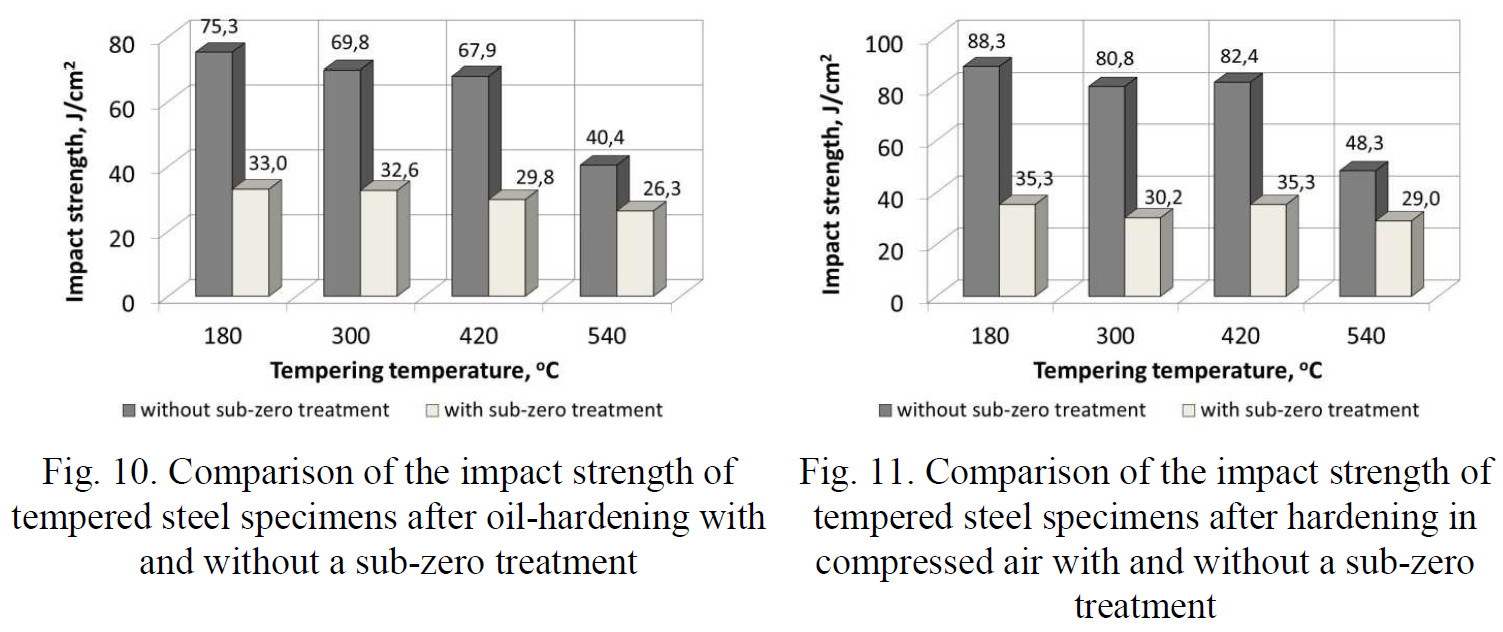 And to round things out another study on A2 tool steel showing a reduction in toughness by using cryo [5]. They tried 0.5 hr and 24 hr liquid nitrogen as well as liquid helium, and all cases led to a reduction in toughness relative to no cryo: