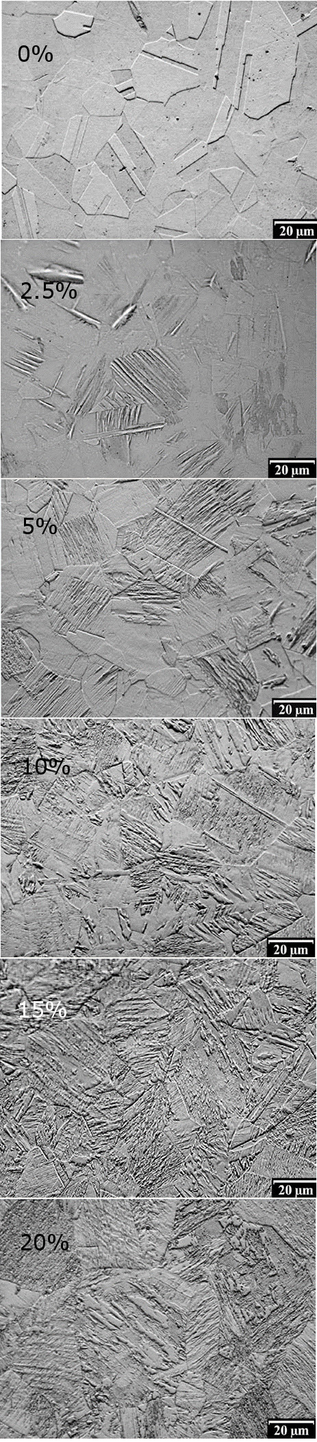 Steels with austenite will transform to martensite when a stress is applied, such as when the steel is bent, pulled, or otherwise deformed. This is known as a strain-induced or stress-induced transformation. This increases the strength of the steel as strong martensite is formed. This martensite is untempered, however, which also decreases the ductility and toughness of the steel after the martensite has formed. Below I have images of a 301 austenitic stainless steel (100% austenite) with increasing percentages of strain (% change in length while pulling a bar of steel) showing the formation of martensite [25]: