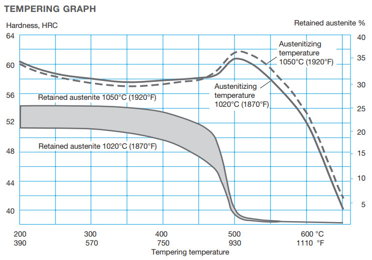 One important interrelation to keep in mind with subzero and cryo studies is the transformation of retained austenite in tempering. With sufficiently high tempering temperatures all/most of the retained austenite is transformed without any cold treatment. This depends on the alloy content, as low-alloy 52100 will have lost its retained austenite with a 500-600°F temper while high alloy steels need over 900°F. You can read more in the article on tempering. With high alloy steels the loss of retained austenite also coincides with “secondary hardening” which is a high temperature tempering treatment that increases hardness [1]: