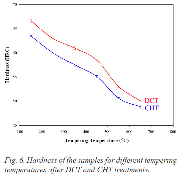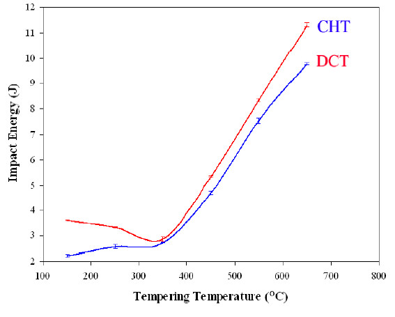 Another example was a tool steel 0.8% C, 3% Cr, and 0.25% Mo (called 80CrMo12-5) where a reduction in toughness was seen with cryo but when compensated for the increase in hardness there is no obvious difference between with cryo and without [13]. DCT refers to the cryo treated material and CHT is the conventional heat treatment. This study used a range of tempering temperatures (150-650°C) but the effect of cryo seems to be consistent across the entire tempering range.