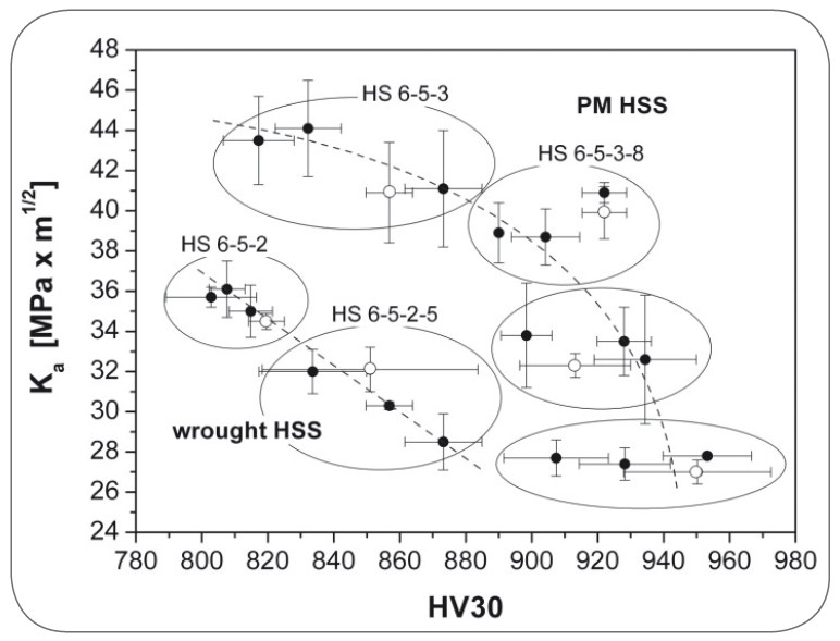 One fairly complete study looked at both conventional and powder metallurgy high speed steels. The powder metallurgy steels had significantly higher toughness than the conventionally produced steels. Within those two categories, hardness was a much stronger factor for toughness than whether cryo was used. The black dots indicate a heat treatment that included a cryo step and the white circles did not use a cryo step [19]: