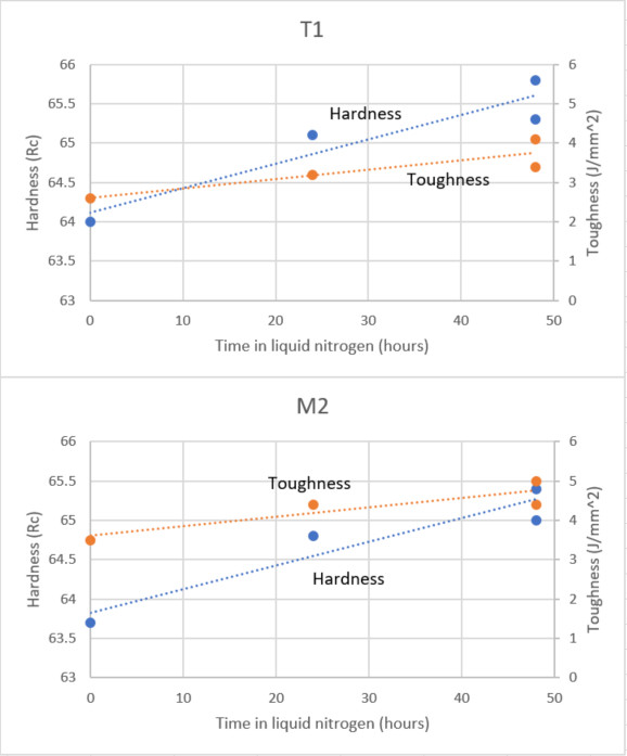 Another study on M2 and T1, two common high speed steels found both a an increase in hardness and also a small increase in toughness [4]. They also found that performing a 48 hour liquid nitrogen between quenching and tempering had improved toughness and hardness relative to a 12 hour treatment, and that 3 separate cycles totaling 48 hours was even better. This result is somewhat surprising to me and I haven’t seen it replicated. Other studies typically do not claim an increase in hardness with more time at cryogenic temperatures.