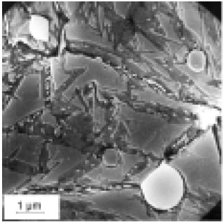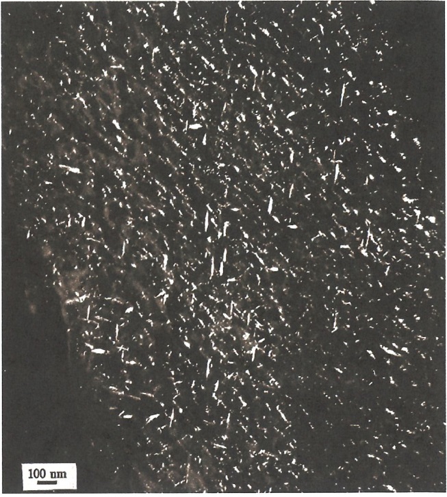 After quenching steel to form hard martensite, the carbon is supersaturated in the martensite of the steel. During tempering, very tiny carbides are formed as the carbon leaves the martensite, even smaller than secondary carbides. You can read more about the formation of tempering carbides in this aticle on tempering of steel. At low temperatures, “transition” carbides are formed, referred to as ε-carbides or η-carbides. Transition carbides are very tiny, typically only viewable with transmission electron microscopy (TEM), which is an expensive and difficult method of microscopy, less common than scanning electron microscopy (SEM) in the micrographs shown above for D2 and 13C26. At typical tempering temperatures, those transition carbides are replaced by cementite, Fe3C. Here is a TEM image of a steel tempered at 150°C (300°F) with a combination of transition carbides and cementite. Tempering carbides are in the nanometer size range rather than the micron size range. In the image below the cementite is the linear carbides around 50-100 nm (0.05-0.1 microns), and the transition carbides are the rows of very tiny round features (2-4 nm) [2]:
