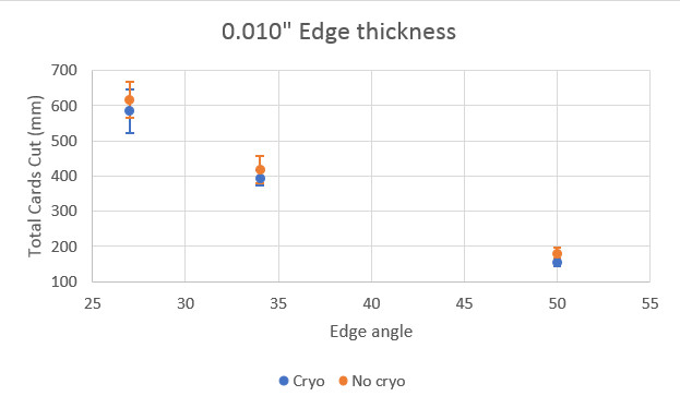 In a 154CM CATRA study that I previously wrote about, many factors were compared including the effect of cryo. The steel was given a 1 hour snap temper at 300°F followed by 4 hours at liquid nitrogen temperatures, and finally tempered at 960-1000°F. The tempering had a range to achieve the same hardness regardless of cryo which was successful, as the cryo-treated steel was 61.7 Rc on average and the non-cryo was 61.5 Rc. There was no difference between cryo and no-cryo, in fact if anything the non-cryo steel was slightly better (higher is better):