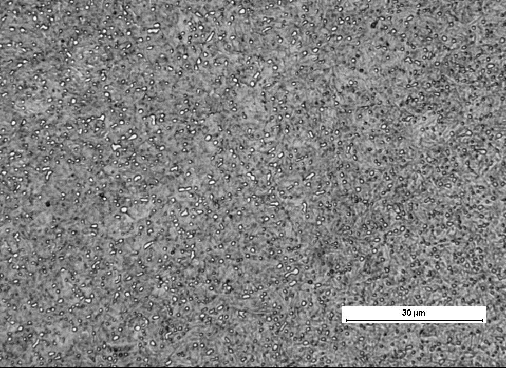 A size cutoff between secondary and primary carbides is difficult to pinpoint, there can even be some overlap. Primary carbides are larger than 1 micron, and typically larger than 3 microns. Some steels do not have primary carbides after typical forging and heat treating and only have secondary carbides. They are designed so that the carbides fully dissolve at forging temperatures and precipitate at lower temperatures where they are smaller than primary carbides that form during casting. Examples of these steels include AEB-L/13C26 and low alloy carbon steels like 1095. Here is a micrograph of 13C26 showing its small secondary carbides:
