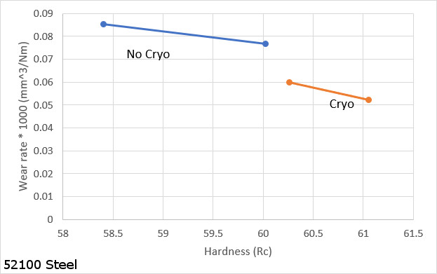 These two studies on 52100 [5] and D6 [16] show relatively simple behavior, with cryo leading to an increase in hardness, but also an improvement in wear resistance even after accounting for hardness.