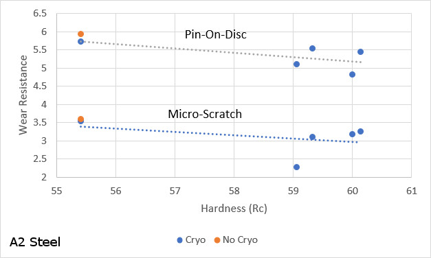 Some studies have also claimed a difference in wear resistance based on the amount of time at cryogenic temperature. These claims rely on a mechanism involving an optimum time for generating the highest density of carbides during tempering. In a study on D2, they found an improvement in wear resistance up to 36 hours, and somewhat lower wear resistance with longer cryo times [8]: