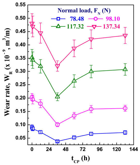 The hardness increased up to 36 hours and remained flat with increased time beyond that, while the secondary carbide amount increased up to 36 hours and decreased slightly. There was a minimum amount of wear at 36 hours (best wear resistance), with somewhat more wear with other cryo times. The authors explain the peak in wear resistance at 36 hours because of the peak in secondary carbide density. There is a relatively large reported increase in carbide fraction from 0 hours to 36 hours, but the carbide fraction only decreases slightly between 36 and 132 hours. Despite that, all of the values on the chart are on the same trend line vs hardness except for the 36 hour cryo condition. In fact, the 0h cryo condition is actually slightly below the trend line (better wear resistance) despite the reported lower secondary carbide fraction. This makes it appear that differences in hardness are the controlling factor for wear resistance and the 36h sample performed better because of experimental variability.