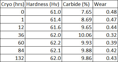 This would allow us to test subzero vs cryo and the effect of cryo time on wear resistance. Using D2 would allow a direct test of the optimization study, without worrying about the possibility that different steels may have a different optimal time.