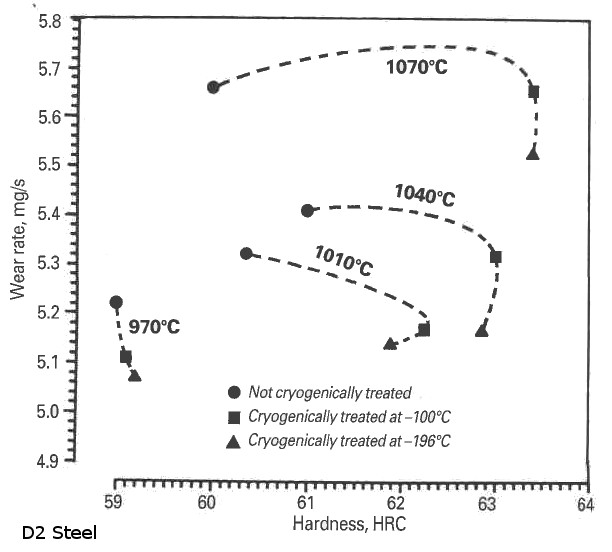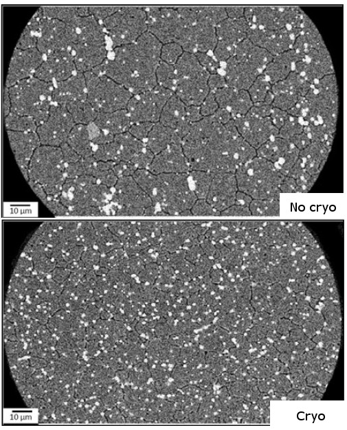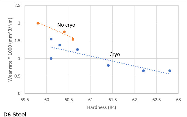 The increase in secondary carbide density is the claim in most of the articles cited in the summary table. One example is this study on D2 [9] where they looked at conventionally heat treated, subzero treated, and cryo treated steel. They found that the liquid nitrogen treated steel had somewhat better wear resistance than the subzero treated steels even though the hardness was essentially the same. However, the improvement was small; there was a larger effect of austenitization/hardening temperature.