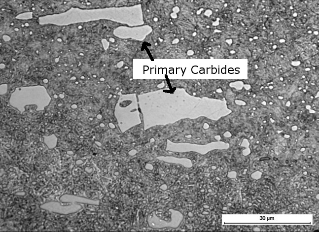 Primary carbides are formed during casting (solidification) of steel, often forming in the liquid iron. These carbides are highly stable, typically large, and are generally not completely eliminated through forging and heat treating. I wrote about why these carbides form and how powder metallurgy helps reduce their size in this article on powder metallurgy