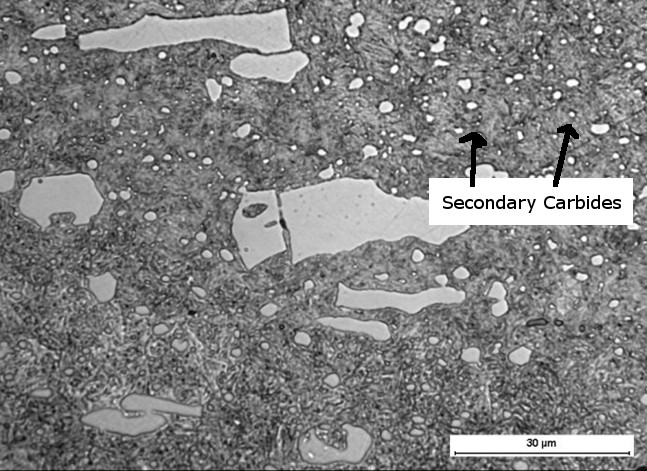 Secondary carbides are those that dissolve during high temperature processing like forging and re-form, or re-precipitate, at lower temperatures. A high alloy steel like D2 or 154CM contains a mixture of both primary and secondary carbides. Here is the same micrograph of D2 from above but instead with the secondary carbides pointed out: