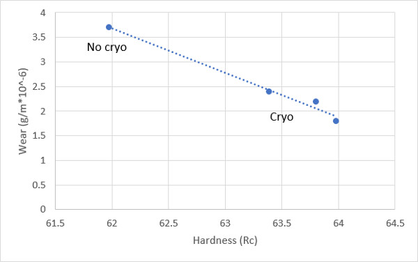 Three of the tests in the table showed no improvement in wear resistance when compensated for hardness [4, 11, 12]. Steel can usually be given a lower tempering temperature to achieve a higher hardness so if the wear resistance is the same when at the same hardness that means that there are no other mechanisms in play from cryo for increasing wear resistance. Here are plots of wear resistance vs hardness showing that there is no clear difference between the cryo-treated and conventionally heat treated steel: