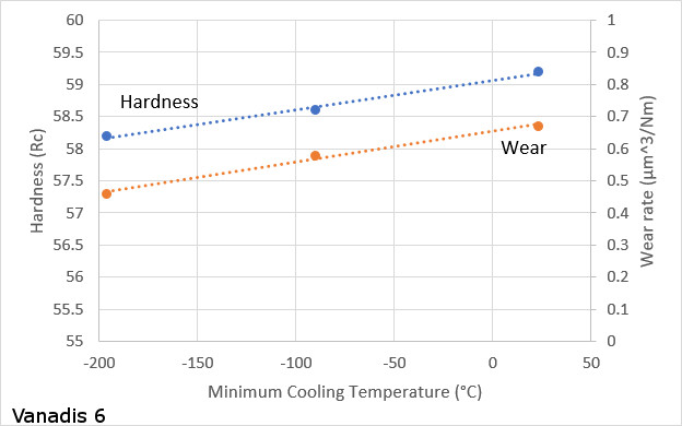 In this study on Vanadis 6 [13] they found that subzero led to a decrease in hardness and that liquid nitrogen led to a further decrease. Wear resistance, however, improved with subzero and liquid nitrogen despite the reduction in hardness. The reduction in hardness is somewhat puzzling and was explained in Part 2 as being from the shift in the tempering curve with secondary hardening. The improvement in wear resistance despite the reduction in hardness seems to indicate that the cryogenic processing was effective in improving wear resistance by a mechanism unrelated to hardness.