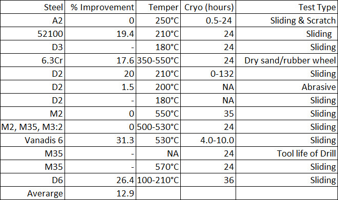 All of these studies looked at several different variables, including a range of hold times at cryogenic temperatures, low vs high temperature tempering, and even powder metallurgy vs conventionally cast steel. The only similarity between them is they used sliding wear tests, but so did many other studies that did show an improvement from cryo. Therefore it is difficult to pinpoint any reason why these studies would find no improvement in wear resistance from cryo apart from hardness, even though other studies did.