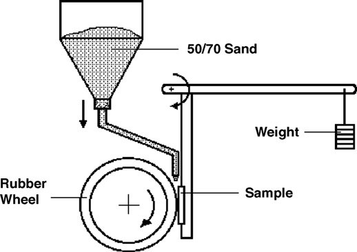The dry sand/rubber wheel is an abrasive wear test that uses sand as the abrasive. The test above listed as “abrasive” was a test with aluminum oxide (alumina). These types of tests are probably more applicable to slicing edge retention. However, the large abrasive size favors steels with large carbides, and carbide size does not have a strong effect on slicing edge retention.