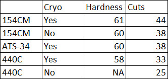 The 440C non-cryo uses an estimated change in hardness of 2 Rc. If the change was only 1 Rc with cryo the chart looks marginally different.  Cryo improved edge retention due to an increase in hardness only.