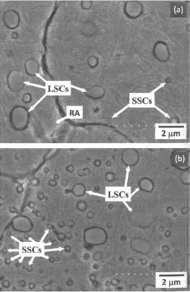 Cryo researchers have instead shifted to a different proposed mechanism for wear resistance improvement: an increase in density of “secondary” carbides. They claim [18] that the cryogenic processing leads to “conditioning of martensite” which means that defects like dislocations are created which leads to clustering of carbon atoms at these defects. During tempering more carbides are then formed because of the dislocations and carbon clustering. You can read more about dislocations in this article on grain refinement. Below are example micrographs showing the difference in secondary carbide density, where they differentiate between large secondary carbides (LSC) and small secondary carbides (SSC) and show that there are more SSCs in the cryo treated D2 [18]: