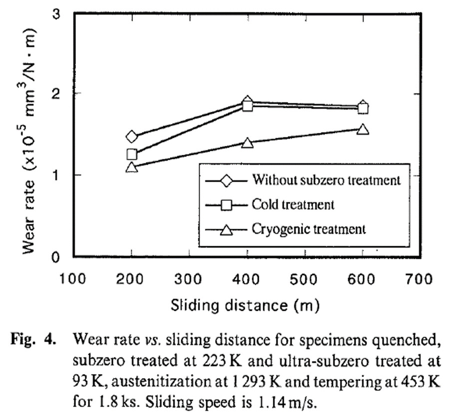 The first study generally cited claiming that carbide formation leads to an improvement from cryogenic processing is from 1994 on D2 steel [10]. They found that the use of subzero processing with dry ice led to little difference in sliding wear resistance but that liquid nitrogen processing led to a significant improvement in wear resistance (lower is better):