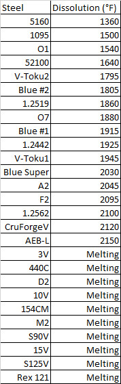 Some forging bladesmiths believe they need to forge stainless and high alloy tool steels at extra high temperatures because they are more difficult to forge. Worse, some “experienced” bladesmiths will tell others that these high alloy steels require such high temperatures. This is the cause of many failures with forging such steels, for the reasons explained above. The high alloy steels see grain boundary melting at similar temperatures to low alloy steels, and have the added complication of carbide coarsening. This can lead to cracking and other issues if forged too hot. It is for that reason that recommended forging temperatures should not be ignored when forging high alloy steels. A maximum temperature of about 2100°F should not be exceeded, and in many cases lower is better if the carbide size is to be optimized.