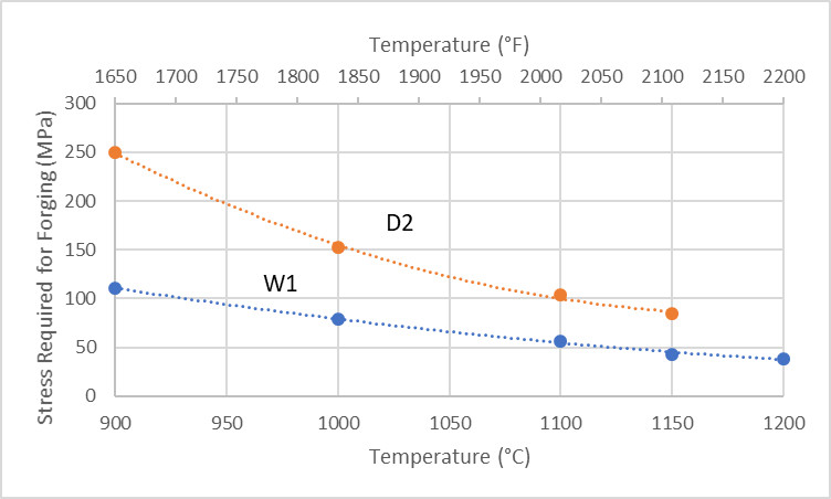 Higher temperatures usually mean that the stress (load per area) required to deform steel is less. The hotter it is the easier it is to shape the steel. The higher the stress measured the stronger the steel is at high temperature. Here is the stress required for forging D2 (high alloy tool steel) and W1 (simple high carbon steel):