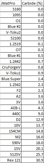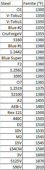The software typically somewhat under-predicts the amount of carbide because it assumes an infinite hold at temperature. Unlike the very simple steels, forging steels with significant amounts of vanadium or tungsten do have some amount of carbide present at forging temperatures, including steels like CruForgeV and Blue Super steel. This would make these steels on the more difficult end for forgeability of the typical “forging steels.” However, you can see that even very high tungsten (~3.5%) low alloy steels 1.2562 and F2 have considerably less carbide at 1000°C than high alloy steels. On the other end of the spectrum, steels like Rex 121 and S125V would be expected to be very difficult to forge. You can see that low alloy steels like 5160, 1095, O1, and 52100 don’t have any carbide at 1000°C, at least as predicted by the software. Therefore I also calculated the temperature at which all the carbide is dissolved: