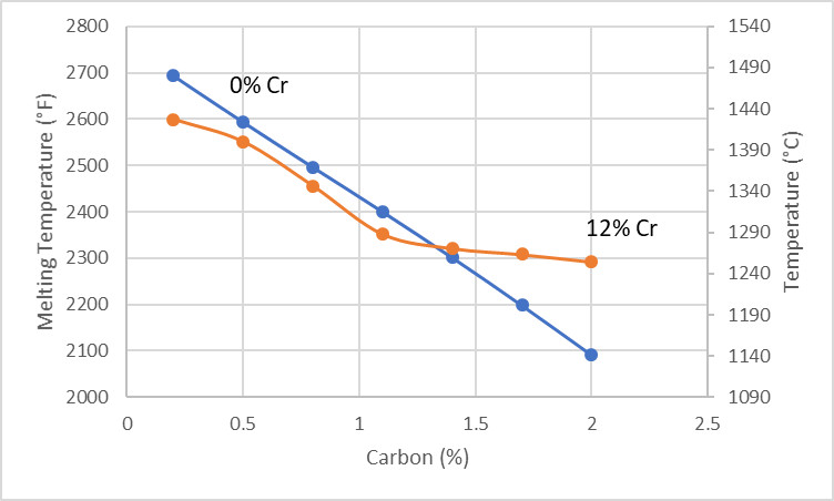 One important factor that leads to a reduction in ductility is the melting of grain boundaries at high temperatures. Cracks form at these melted grain boundaries. Knife steels are somewhat susceptible to this behavior because they are high in carbon. This effect of carbon remains even with significant alloying additions, as shown by the comparison 12% Cr line below: