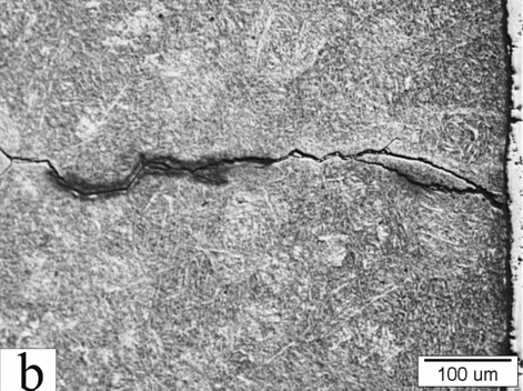 While a 1.1% carbon steel is shown to have a melting temperature between 2350-2400°F, the temperature at which grain boundary melting can occur is significantly lower. This is because of segregation of carbon and alloying elements to the grain boundaries that leads to locally richer areas. Grain boundary melting has been reported as starting around 2200°F for several steels including O1 [3] and D2 [8]. There is some time required for the melting to start, of course, with sufficiently short soaking times melting is not observed. However, insufficient soaking is not recommended, and using safer lower temperatures is easier than trying to maintain short soak times. Below is a comparison between the microstructure of forged D2 when it was soaked at the optimum temperature (a) vs too high temperature (b). In (b) you can see thick black lines which are microcracks along the former grain boundaries:
