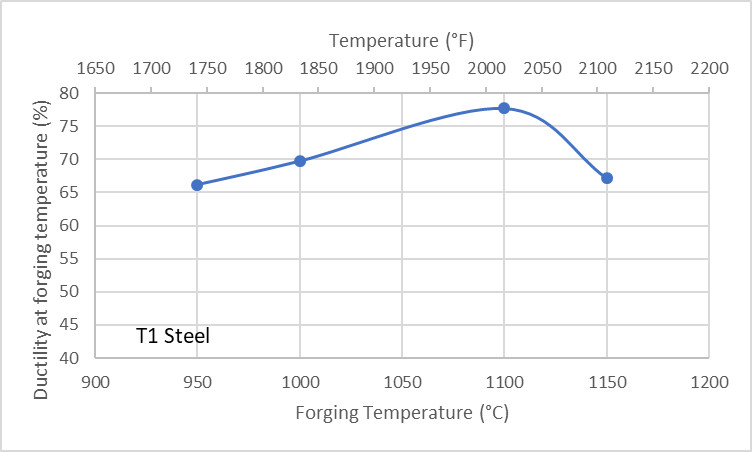 The strength of steel at high temperature is not the only important measure of “forgeability.” Another is ductility, or the amount of strain the steel can withstand before it begins cracking. Typically, the ductility increases as the strength goes down and temperature goes up. However, for every steel there is a temperature beyond which the ductility goes down, as can be seen in this chart of ductility vs temperature for T1 high speed steel: