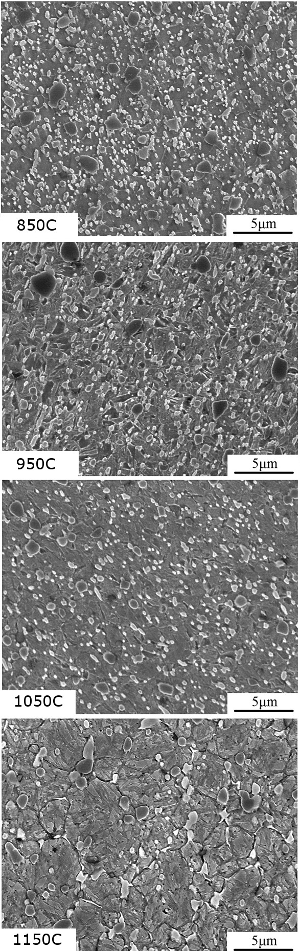 While on the subject of carbide size, even when the carbides have not grown to the extent that they are affecting hot ductility, there are optimal soaking temperatures that lead to the finest carbide size. This is dependent on the steel in question, of course. Too low and the larger carbides cannot be broken up in the forging process, too high and the carbides will coarsen. Here are micrographs of a sprayform Vanadis 4 (non-extra) steel where they forged from different temperatures, where the finest carbide size was achieved with a temperature of 1050°C (1925°F):
