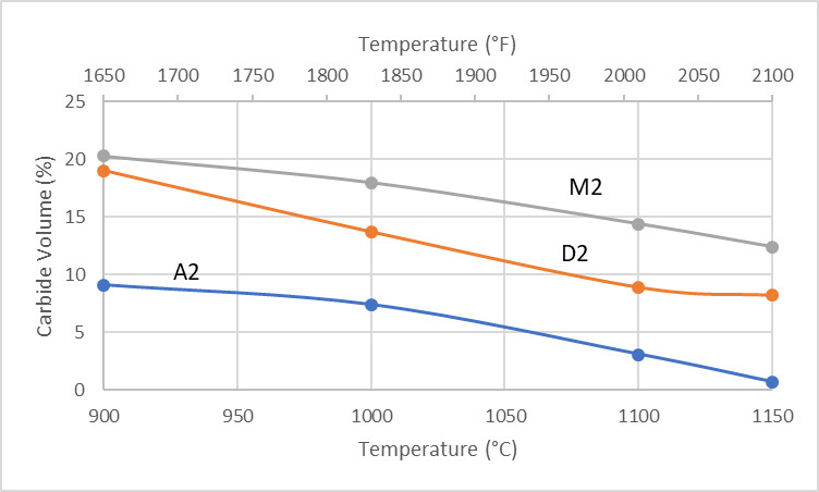 As the temperature decreases, more carbides are formed in the steel. More carbide means higher stress required for forging and lower ductility. These carbides precipitate as fine particles as the temperature decreases which increases strength and decreases ductility [6]. Below I have plotted the evolution of carbide volume fraction with temperature for A2, D2, and M2: