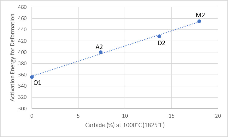 In the earlier chart showing activation energy vs carbide volume, the energy for forging D2 is lower than M2 due to its lower carbide volume fraction. However, the carbides are larger in D2 than M2 which leads to a lower hot ductility than M2, despite the lower stress required for forging [10].