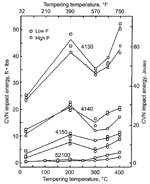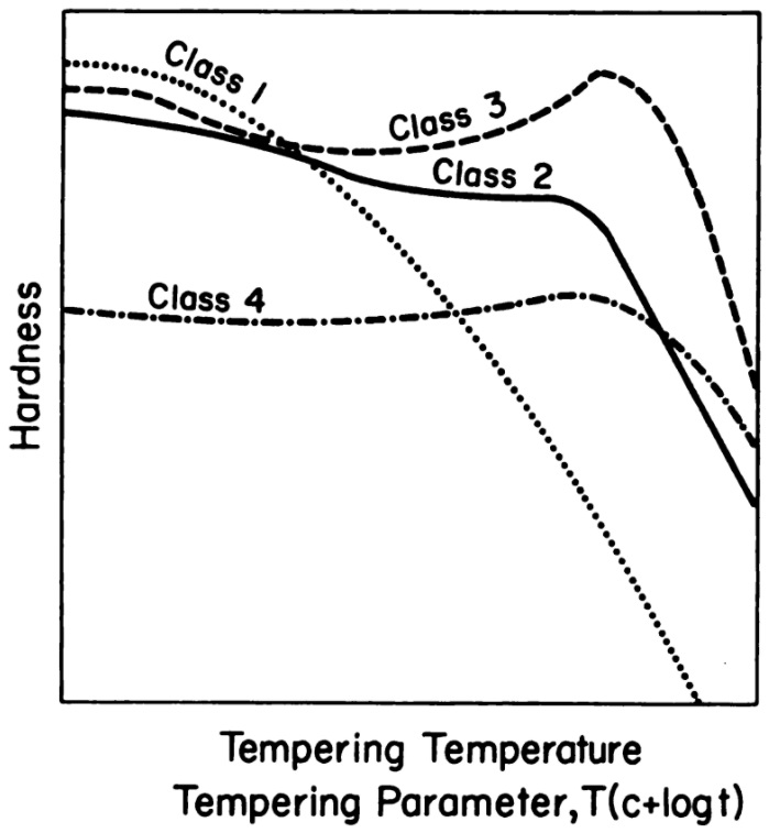 Differentially heat treatments generally refers to methods that achieve a hard edge but a soft “spine.” There are several methods for achieving this, including: 1) heating only the edge prior to quenching so that the spine never hardens, 2) using insulation such as clay on part of the blade so that it isn’t cooled as rapidly as the rest of the blade, and 3) tempering back part of the blade to a higher temperature. And those three different methods can be completed in a variety of ways, though the principles are the same. For method number one, torch hardening can be difficult to achieve an even temperature and to soak sufficiently, so best is an “easy” to heat treat steel as discussed above. In other words, a steel that requires a relatively low temperature to austenitize and the carbide dissolve rapidly, such as 1084. Read the article I linked at the end of the “Ease in Heat Treating” section to learn more. Method 2 requires a steel with low hardenability so that the insulated area does not transform to martensite. An air hardening steel will still transform to martensite even with clay. The typical low hardenability steels are 1095 and W2. W2 is essentially just 1095 with a vanadium addition which refines the grain, a finer grain size means lower hardenability. Other steels with a little more hardenability can be heat treated with the same method, but will not be as easy to have the dramatic hamon designs that can be accomplished with W2. You can learn more about which steels have more hardenability than others in this article. Method 3 requires a steel that has low tempering resistance so that tempering the spine back will actually lower the hardness. Most low alloy steels have sufficiently poor tempering resistance, as they are part of “Class 1” below. You can read about how alloying elements affect tempering resistance in this article.