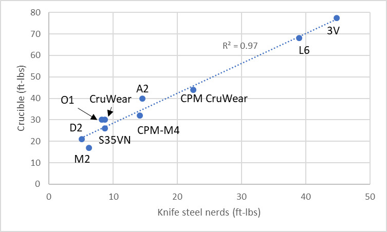 The three charts above also fit neatly into useful categories for us to select from as well. Low-alloy steels are those that are easiest to forge and therefore offers us a range of choices for forging bladesmiths. For knives that require stainless steel we can select from those steels. And high-alloy non-stainless steels offer combinations of properties that aren’t currently available in stainless steel. For a few steels I have also estimated toughness using reported numbers from Crucible steel by correlating my results with theirs (we use different toughness samples, hence the difference):