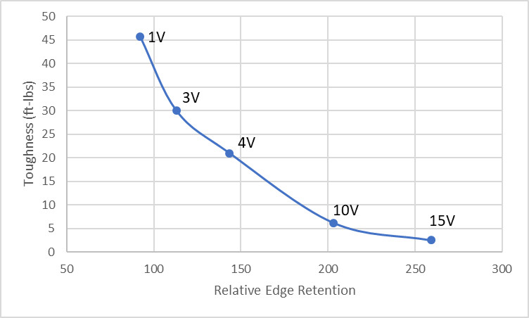 Every steel has some relative toughness and edge retention, and we would like to have the maximum combination of both. In general, more carbide means lower toughness but higher edge retention. The carbide hardness doesn’t matter much for toughness. But harder carbides lead to better edge retention. Therefore, the best combination of toughness and edge retention usually comes from using the hardest carbide, usually vanadium carbides. So the level of toughness and edge retention is set by how much vanadium carbide is present, with a small amount of vanadium (1% in 1V, Z-Tuff) meaning high toughness and relatively low edge retention, to a high amount of vanadium (10% in 10V, 15% in 15V) means high wear resistance and relatively low toughness. But the low toughness steel will have higher wear resistance than other steels in the same toughness class, and the high wear resistance steel will have superior toughness to other steels in the same wear resistance class. Hopefully that makes sense. Read it a few more times if it didn’t. With powder metallurgy tool steels properties can be estimated almost entirely by the vanadium content, such as 1V, 3V, 4V, 10V, 15V in order of increasing vanadium content and wear resistance.
