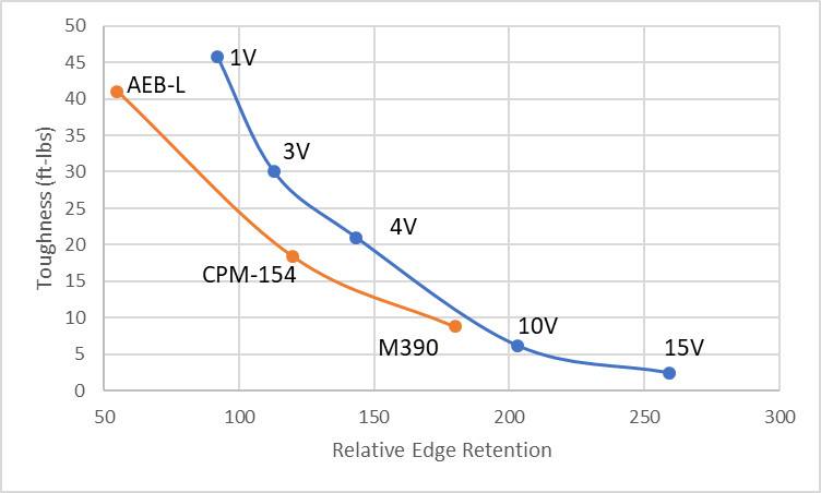 For stainless steels there is at least some chromium carbide which contributes less to wear resistance than vanadium carbide but reduces toughness to more or less the same degree, so for a given level of toughness there is less edge retention. CPM-154 and M390 both showed good levels of toughness in our testing when considering their level of edge retention so they are my current recommendations: