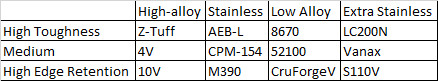 Note 2/19/2021: Since writing this article my suggestion for “medium” stainless has changed from CPM-154 to CPM MagnaCut, my high edge retention stainless recommendation has changed from M390 to  CPM S90V, and my high edge retention high alloy steel recommendation has changed from 10V to Vanadis 8.