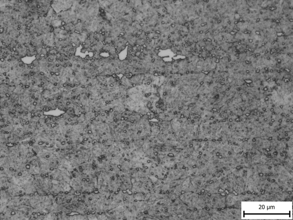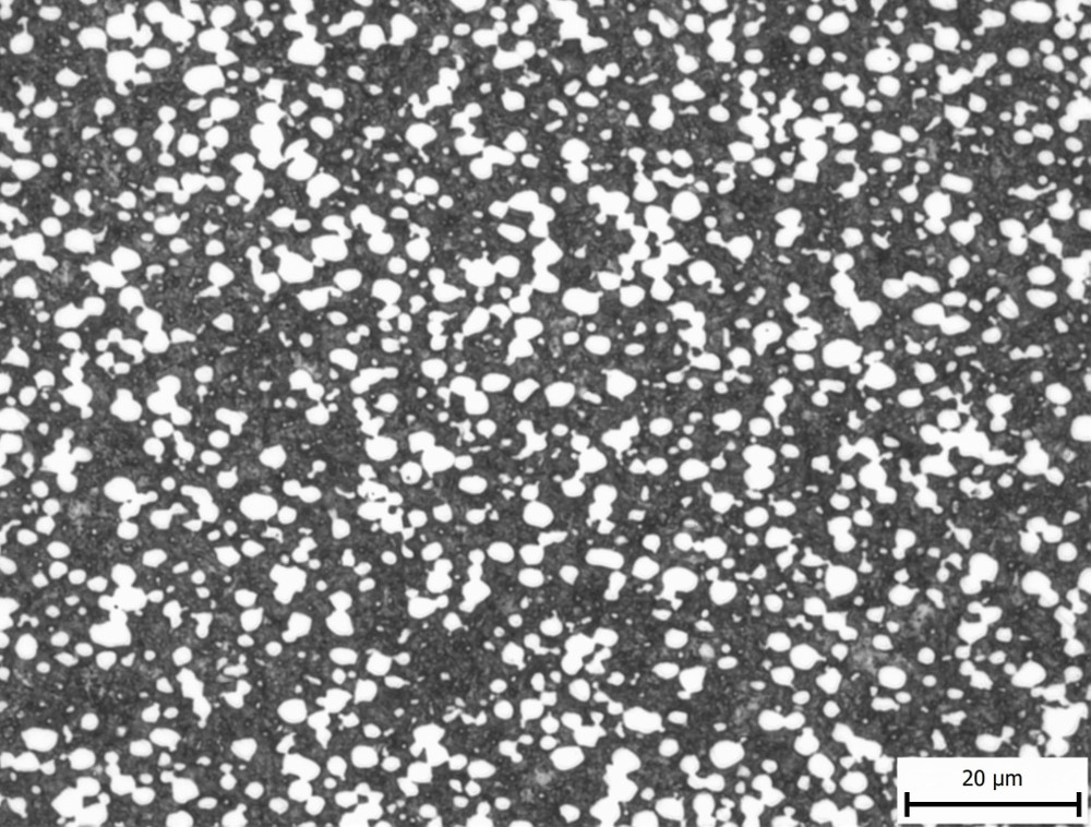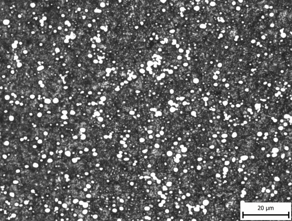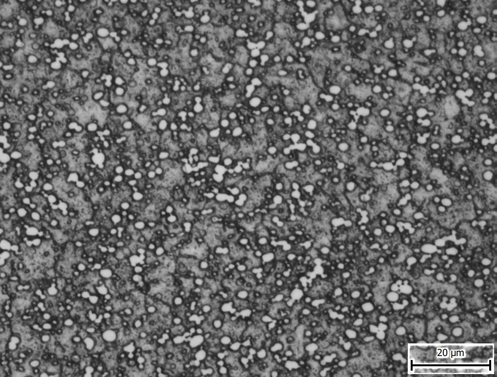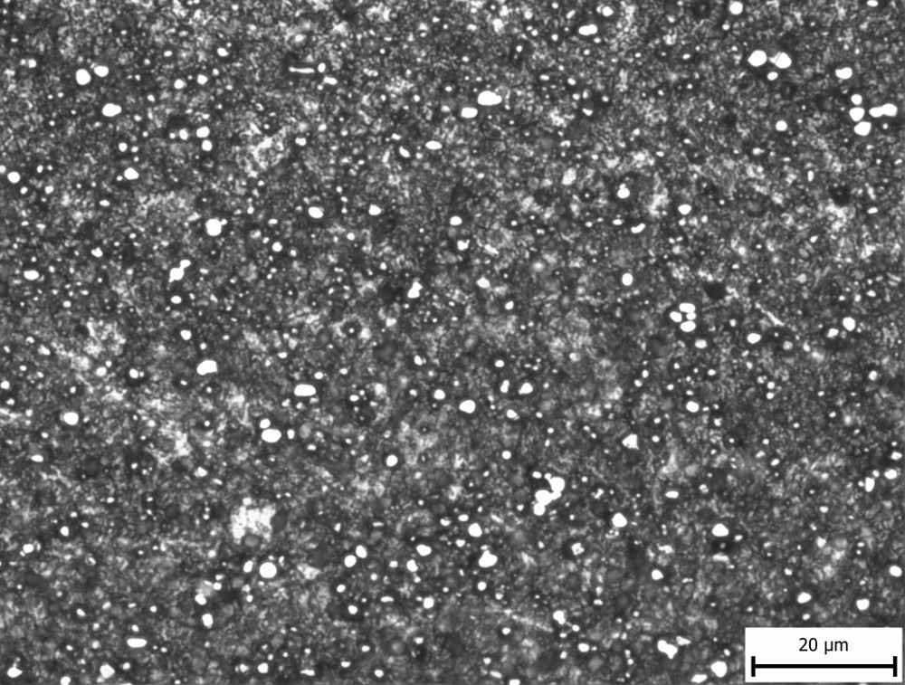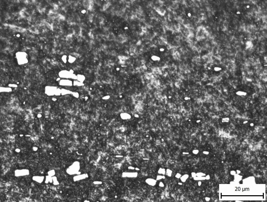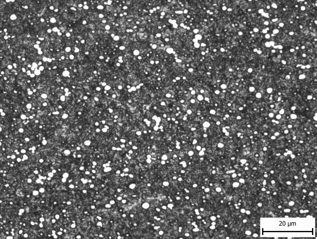 The in-development NioMax has a much more uniform microstructure. The carbide volume is small (<6%) but is made up of niobium carbides which are on the order of a few microns, similar in size to the more carbide-rich powder metallurgy stainless steels: