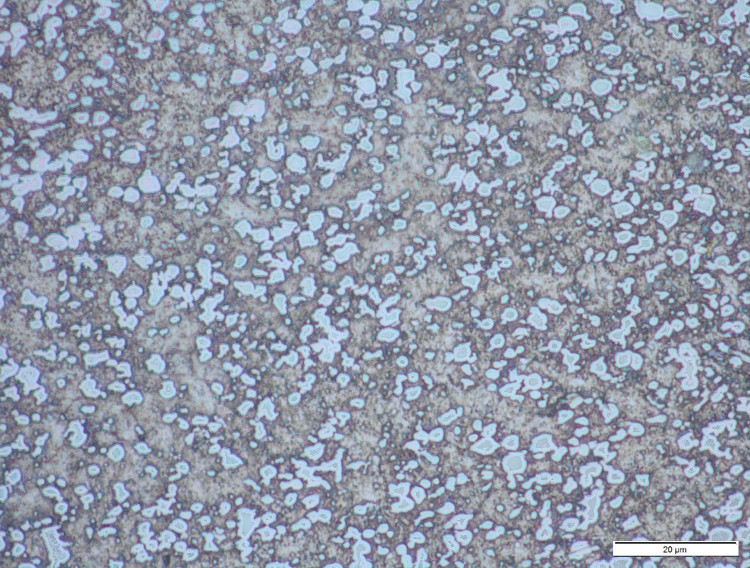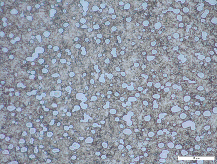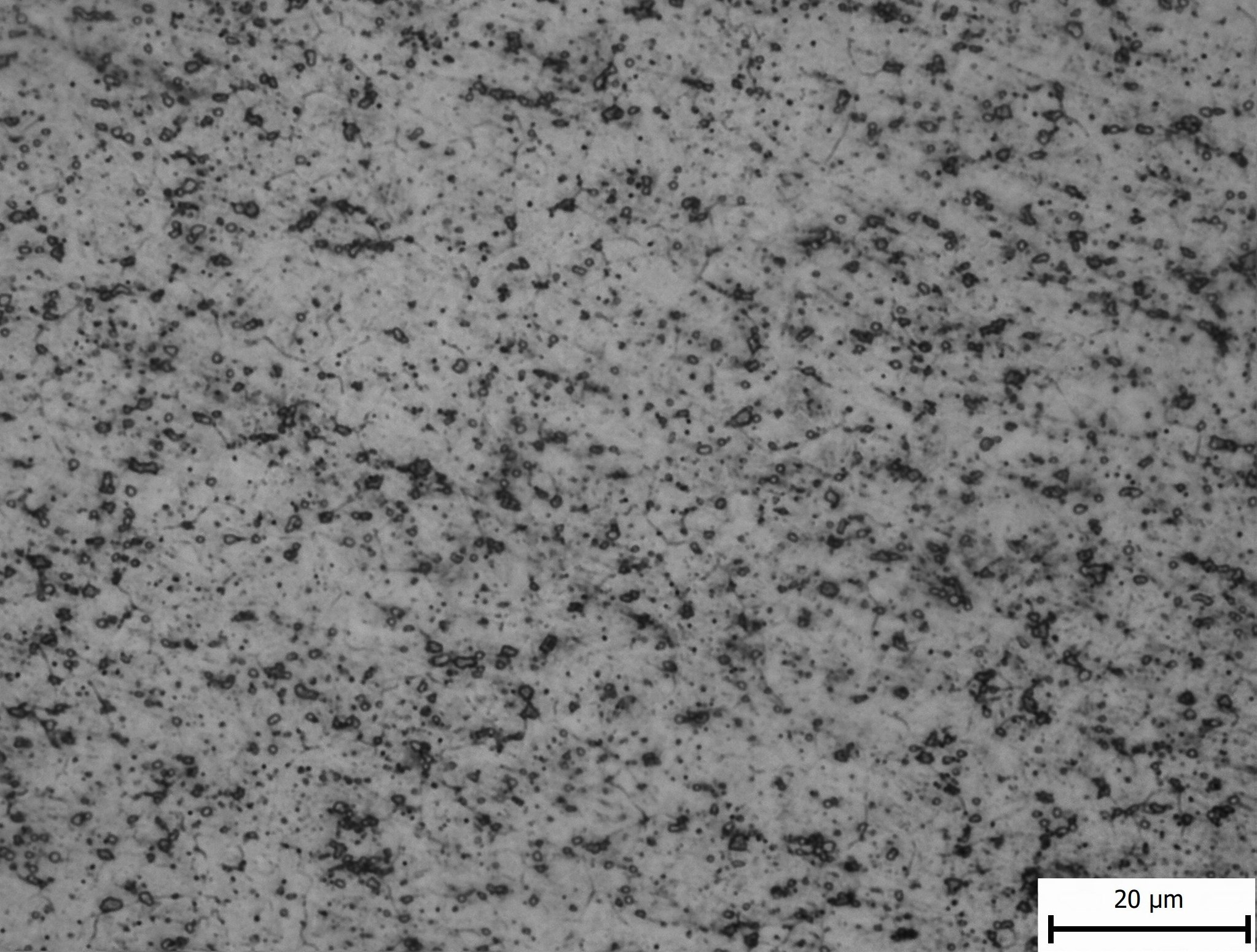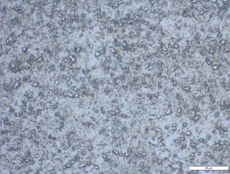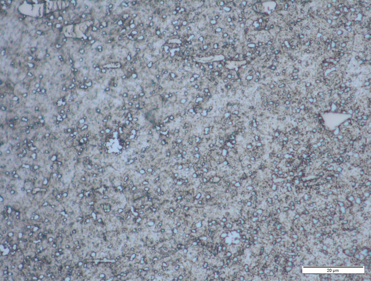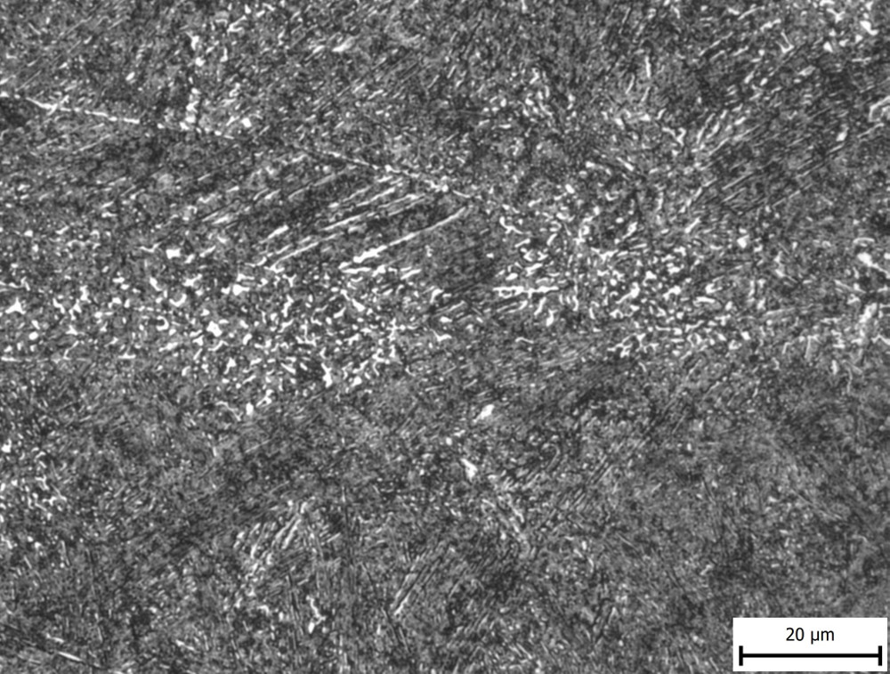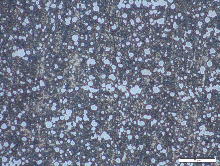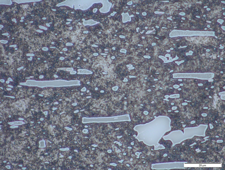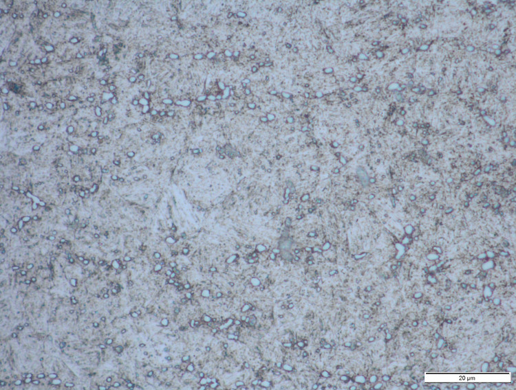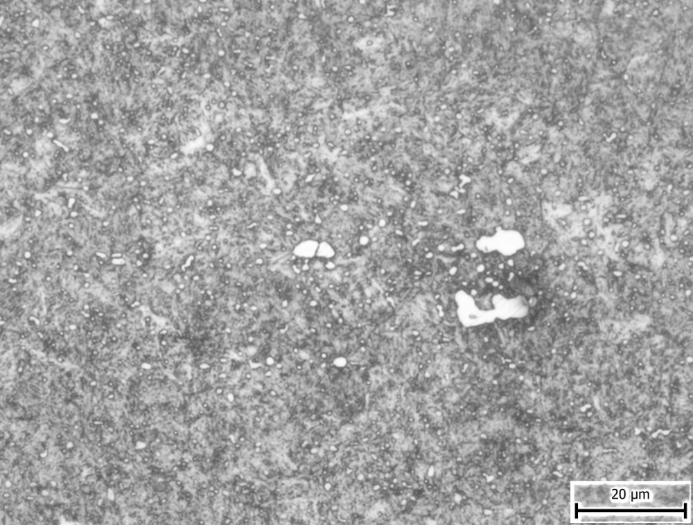 The in-development NioMax has a much more uniform microstructure. The carbide volume is small (<6%) but is made up of niobium carbides which are on the order of a few microns, similar in size to the more carbide-rich powder metallurgy stainless steels: