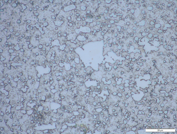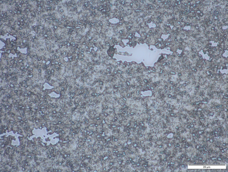 There are not many stainless steels with intermediate carbide contents. X50Cr15MoV (1.4116) has a usually fine microstructure but there are occasional large carbides which may be detrimental to toughness. The top image shows a region with fine carbides, and the second image shows a segregated region with a large carbide: