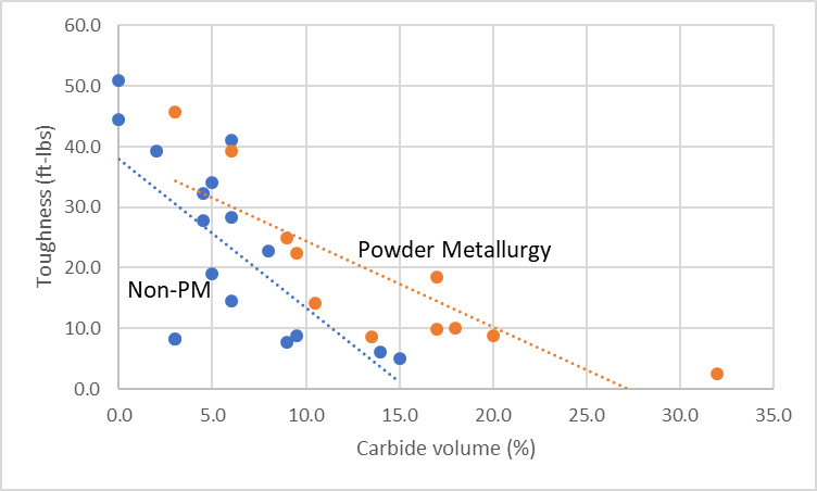 I have correlated carbide volume versus toughness in the chart below, for hardness between 58-62 Rc, except for Rex 121 which was 67 Rc. It is clear there is a correlation between carbide volume and toughness but there is a significant amount of scatter for the reasons described above. 1095 and O1 in particular throw off the trend lines. Powder metallurgy in general shows better toughness for a given amount of carbide, but the difference is greatest for high carbide volumes. At small amounts of carbide non-PM steels can have similar or better toughness depending on the composition.